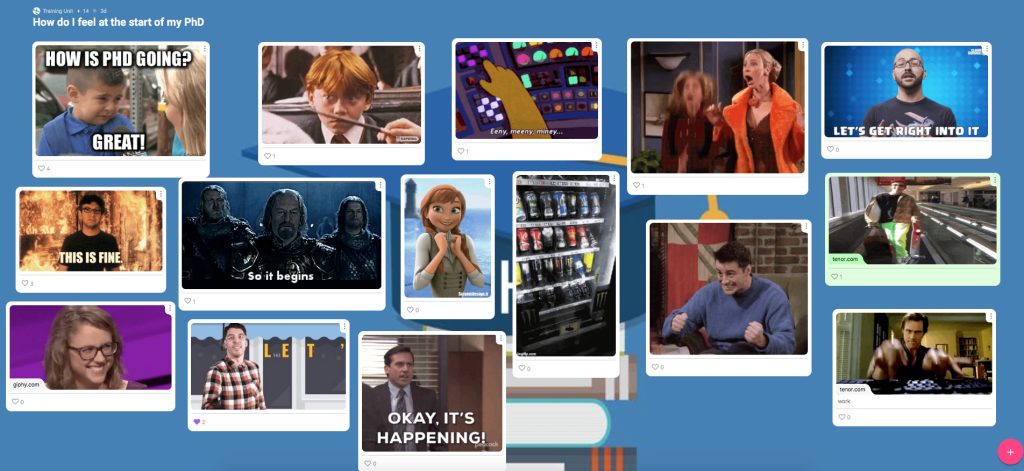 A couple of weeks before the event, we had been asked to find and post a GIF image each to describe their feelings about ourrespective PhD projects. The old proverb says “one picture is worth a thousand words”, so you would think that an animated one would be adequate to describe these feelings. Well, wrong! There were so many feelings and thoughts in our minds regarding our forthcoming PhD project, and some of them do not even have a word dictionary. Nonetheless, we all tried our best to focus on one of those feelings and we ended up with a highly expressive wall of GIF images.