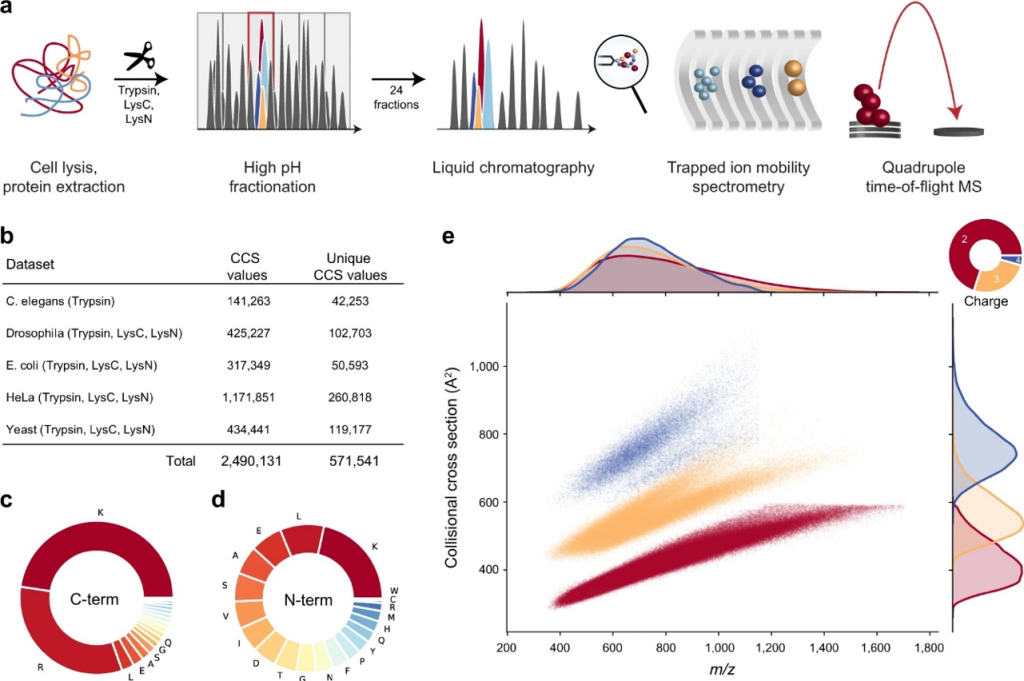 In this paper, Meier et al. have recently integrated trapped ion mobility spectrometry (TIMS), with a high-resolution quadrupole Time Of Flight (TOF) mass analyzer to add an additional dimension for improving MS-based proteomics analysis [3]. In addition to this, they investigated a novel scan mode parallel accumulation – serial fragmentation (PASEF) and demonstrated that it increases MS/MS rates more than ten-fold without any loss in sensitivity. Accordingly, the combination of TIMS and PASEF should allow the acquisition of ion mobility values on a very large scale. By measuring the ion mobility coefficient (K0), they derived a collisional cross-section (CCS) for all measured peptides.