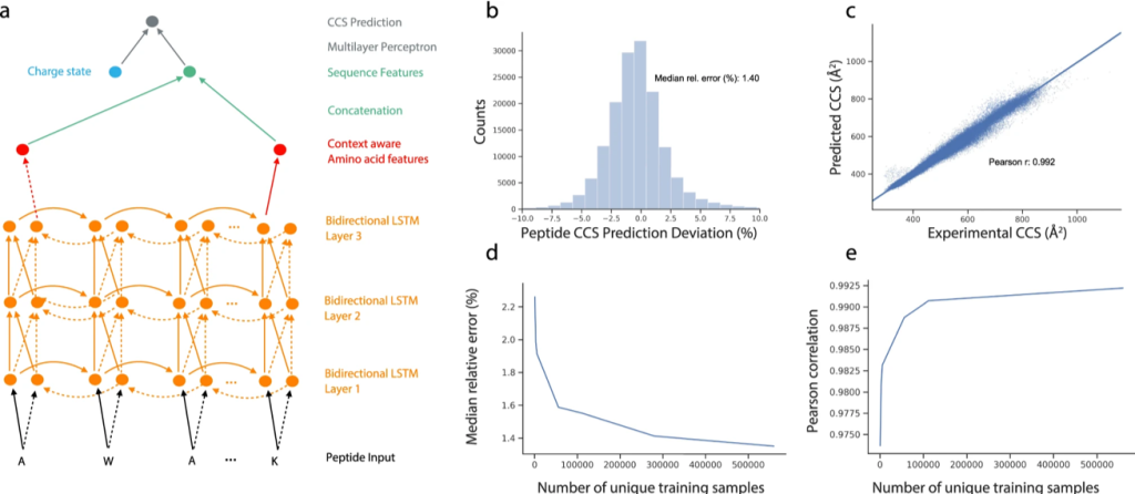 So, did it work? After training from the experimental dataset for workflow mentioned above, they tested the neural net with a different dataset from ProteomeTools containing 155004 sequences, and guess what? The CCS value predictions were within a deviation (MdAD) of about 1.4%, (Fig 2b) which is great. But the deviation observed with experimental data (from ProteomeTools) was even lower at 0.6%. So, there is room for improvement. The 1D CNN approach we mentioned earlier, has recently reported deviations as low as 1.28%.