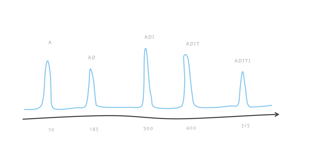 The same process happens with a peptide called ADITI. The peak at 300 is due to ADI, and as T is about 100, we get a peak at 400 corresponding to ADIT.