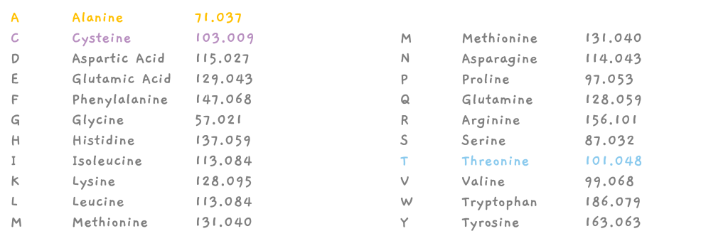 This tells us that X2 must be an amino acid with a weight 70. Go through the amino acid list, there is an amino acid corresponding to 70, it’s A, Alanine. So, X2 must be A. And finally, the peak at 273 must be from the whole peptide X1 X2 X3, so since X1 X2 is 173, X3 must be an amino acid with mass 100. Which our list tells us, X3 must be T.
