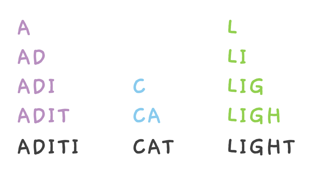 ADITI can break into A, AD, ADI and ADIT and so on.