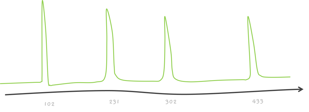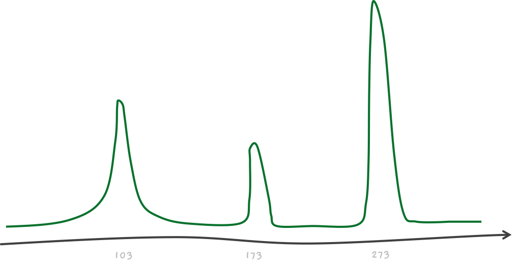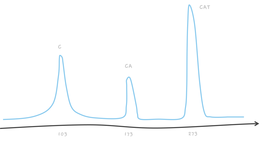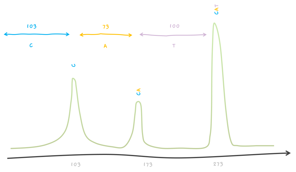 For example, talking about CAT, we know that amino acid C weighs about 103 giving us a peak at 103. Similarly, we know that A weighs about 70, so the mass of CA must be 103 + 70 = 173, where we see the second peak. The mass of amino acid T is about 100, giving us another peak from CAT, at 103 + 70 + 100 = 273.