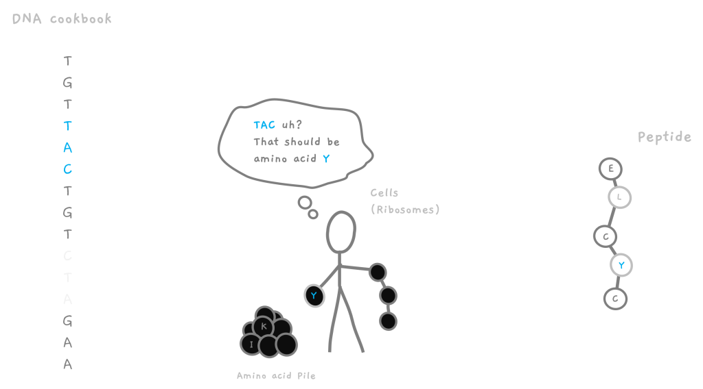 These proteins are built inside your cells using tiny molecules called amino acids ????, which are like the ingredients in your recipe. These cells are guided by the instructions in the DNA on how to put together particular proteins. Picture a cake ????, it needs flour, eggs, sugar, and butter, all in specific quantities and added in a certain order. Similarly, proteins need specific amino acids in the right order to be cooked up right. DNA has the recipe, cookbooks ????. Amino acids are the ingredients. Proteins are the dishes ????️. Hungry yet? ????