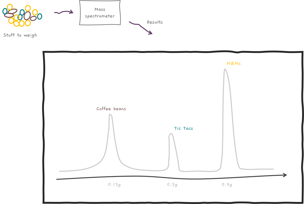 But wait, there’s more! We usually measure a lot of things at once, and mass spectrometers don’t just stop at weighing. They also measure quantities ????. It’s like a super-smart scale saying… “Oh, your sample had more M&Ms ???? than Coffee beans ☕ in your Mocha coffee bean cookie ????.” How cool is that!?